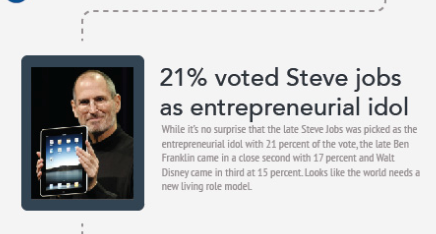Small business owners were also asked to reveal their entrepreneurial idol. I smiled when I saw two my top three make the list. At number one, Steve Jobs accounted for 21%. Believe it or not however, Ben Franklin came in second with 17%. And, running a close third was Walt Disney with 15%.